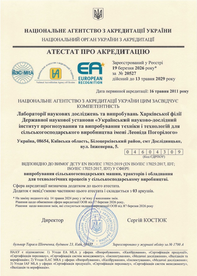 - сертифікаційні випробування та випробування на відповідність вимогам технічних регламентів сільськогосподарської техніки згідно затвердженої галузі акредитації.