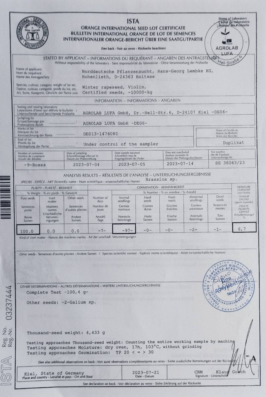 У рамках участі в «Субпроєкті з екстренної підтримки аграрного сектору» щодо питань японської грантової допомоги Урядом Японії через японське Агентство з міжнародного співробітництва (JICA) 10 Серпня 2023 року УкрНДІПВТ ім. Л. Погорілого отримали першу допомогу у вигляді насіннєвого матеріалу озимого ріпаку.
