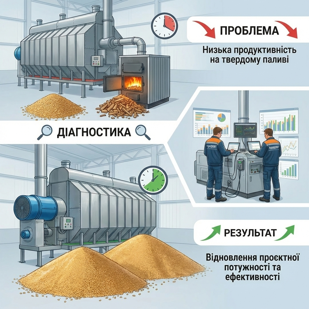 Фахівці УкрНДІПВТ ім. Л. Погорілого підходять до цього питання комплексно та системно. Ми проводимо професійне тестування вашої сушарки в технологічному поєднанні з теплогенератором, щоб виявити реальні причини втрати продуктивності.
