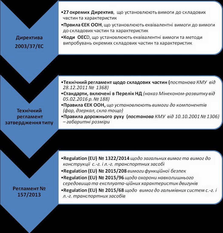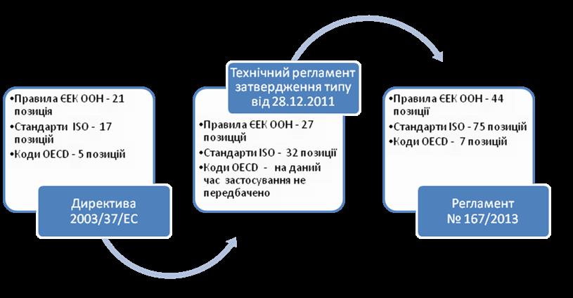 Перелік документів, які встановлюють вимоги в Директиві 2003/37/ЄС, Технічному регламенті затвердження типу та Регламенті № 167/2013, наведено на рис. 1.
