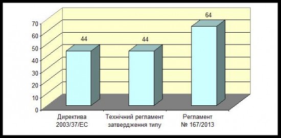 Всього в Регламенті № 167/2013 доповнено 20 (30 %) об’єктів регулювання, що в цілому складає 64 складових частини і характеристик, до яких установлюються вимоги (рис. 5).
